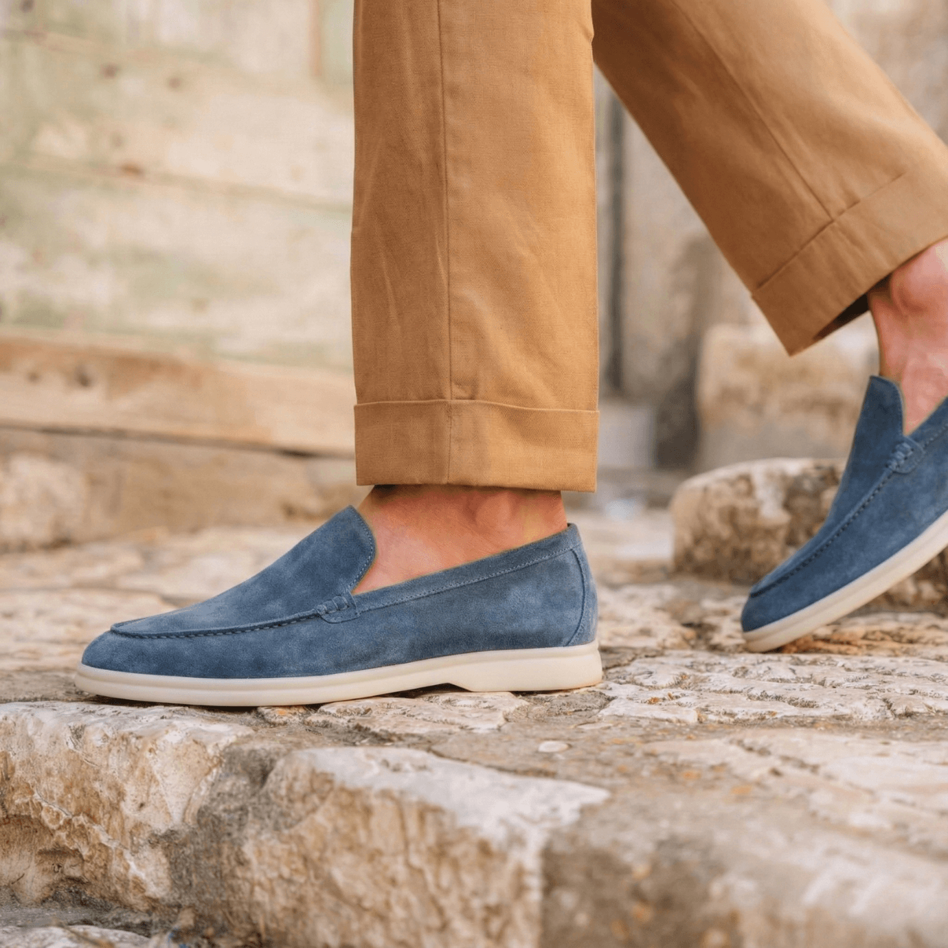 Cut from premium suede and left unlined for enhanced softness and breathability, they mold effortlessly to the foot with wear. The lightweight rubber sole ensures all-day comfort, while the hand-stitched apron and side seams reflect a quiet mastery of detail. Designed for warm-weather ease, they transition seamlessly from resort paths to city streets, with or without socks.