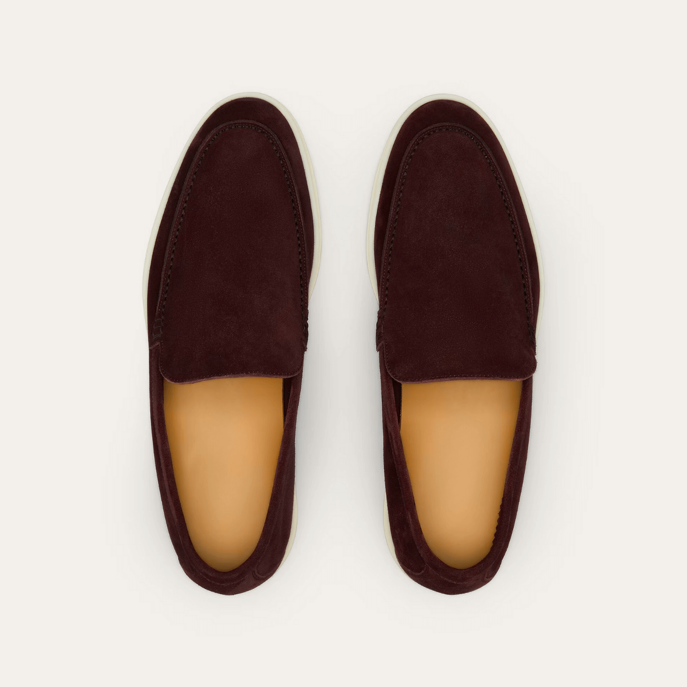 Cut from premium suede and left unlined for enhanced softness and breathability, they mold effortlessly to the foot with wear. The lightweight rubber sole ensures all-day comfort, while the hand-stitched apron and side seams reflect a quiet mastery of detail. Designed for warm-weather ease, they transition seamlessly from resort paths to city streets, with or without socks.